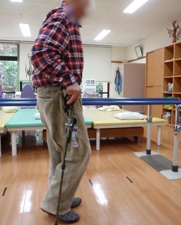 ※写真は腰痛のある利用者様です。やや前傾姿勢になり疼痛をかばう様に歩行されています。