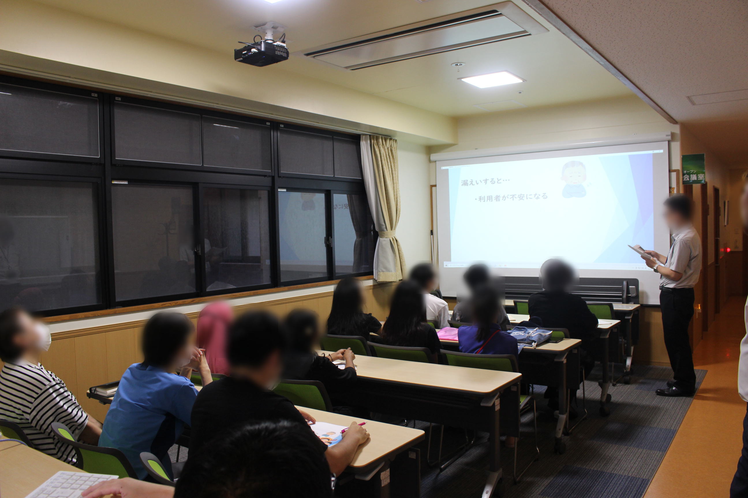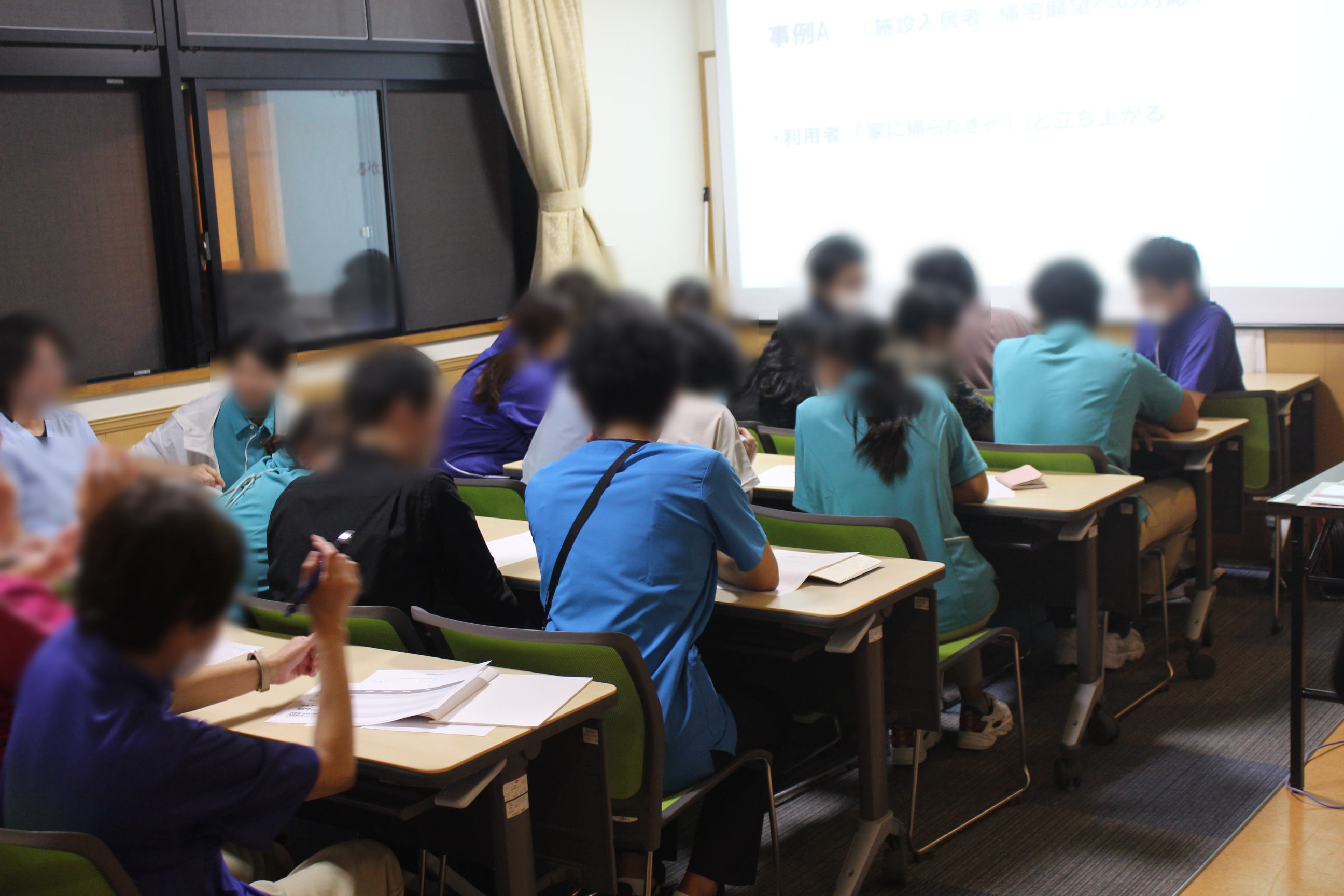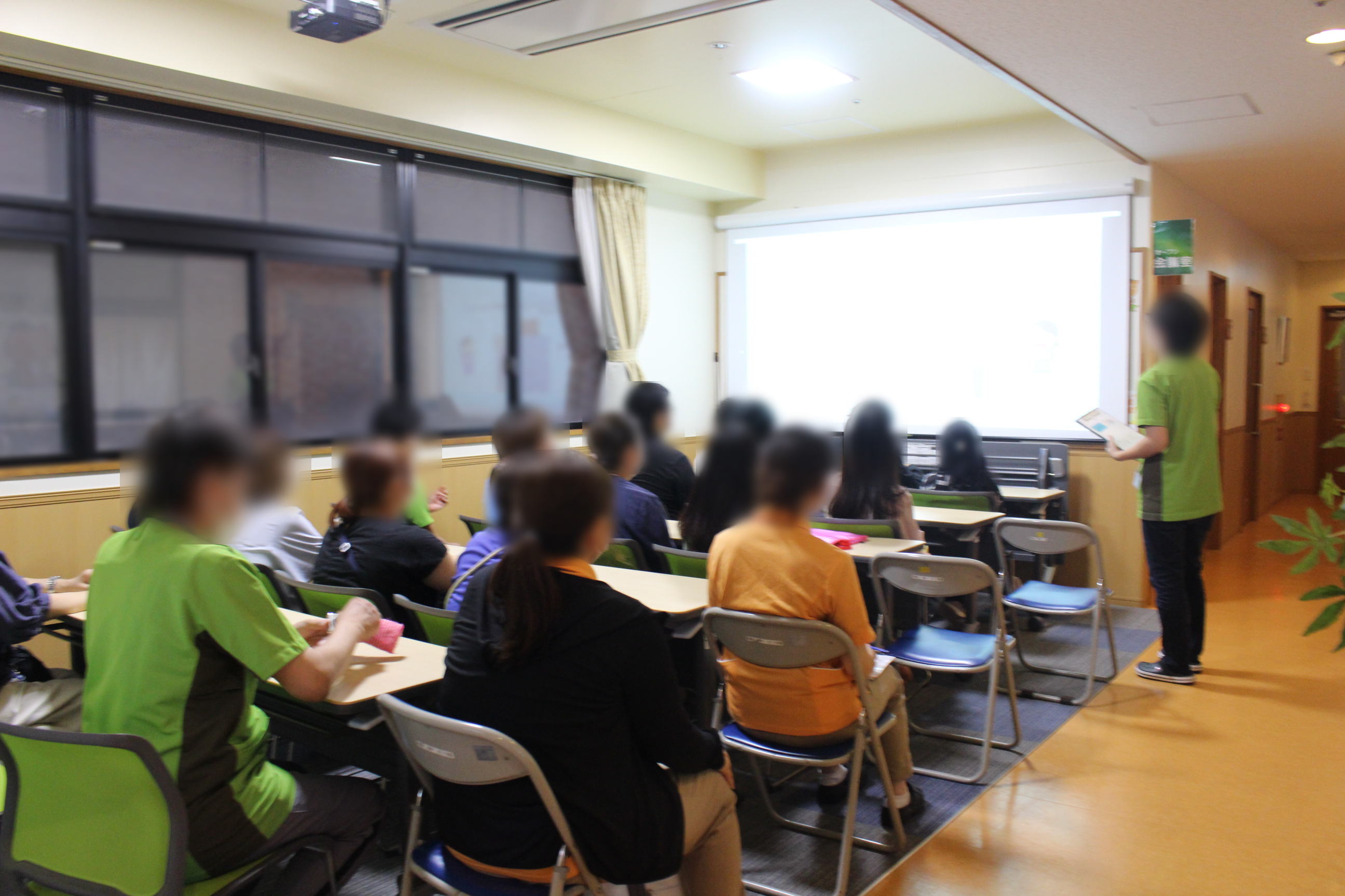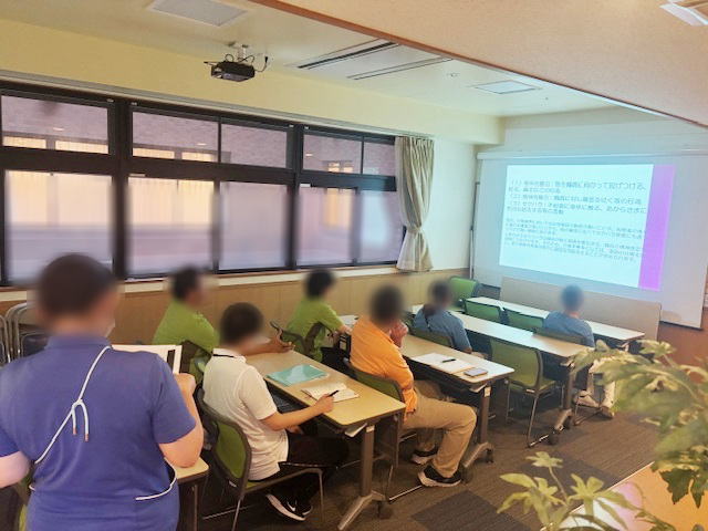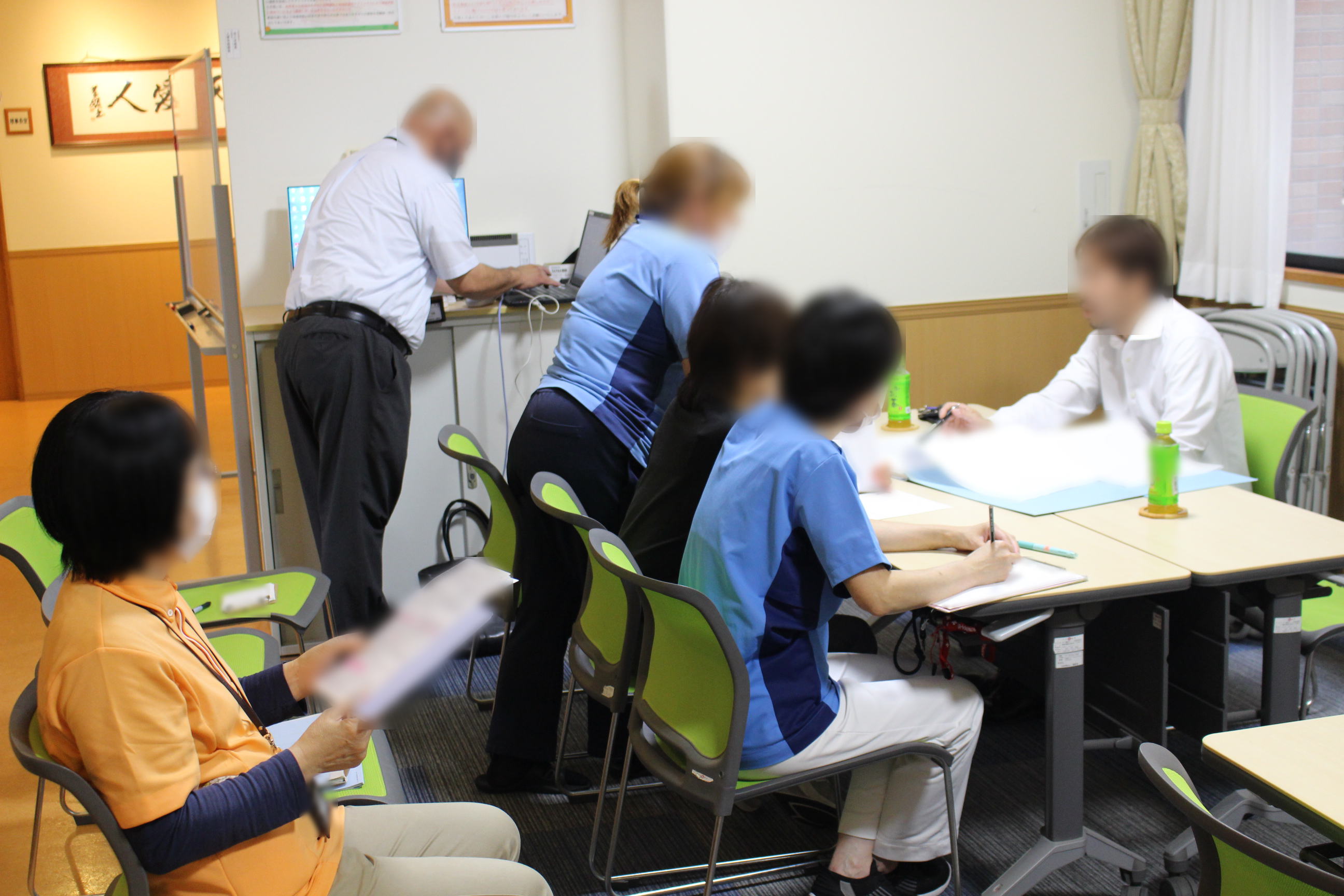 職員同士で確認し合い、和やかな雰囲気の中で学んでいます。