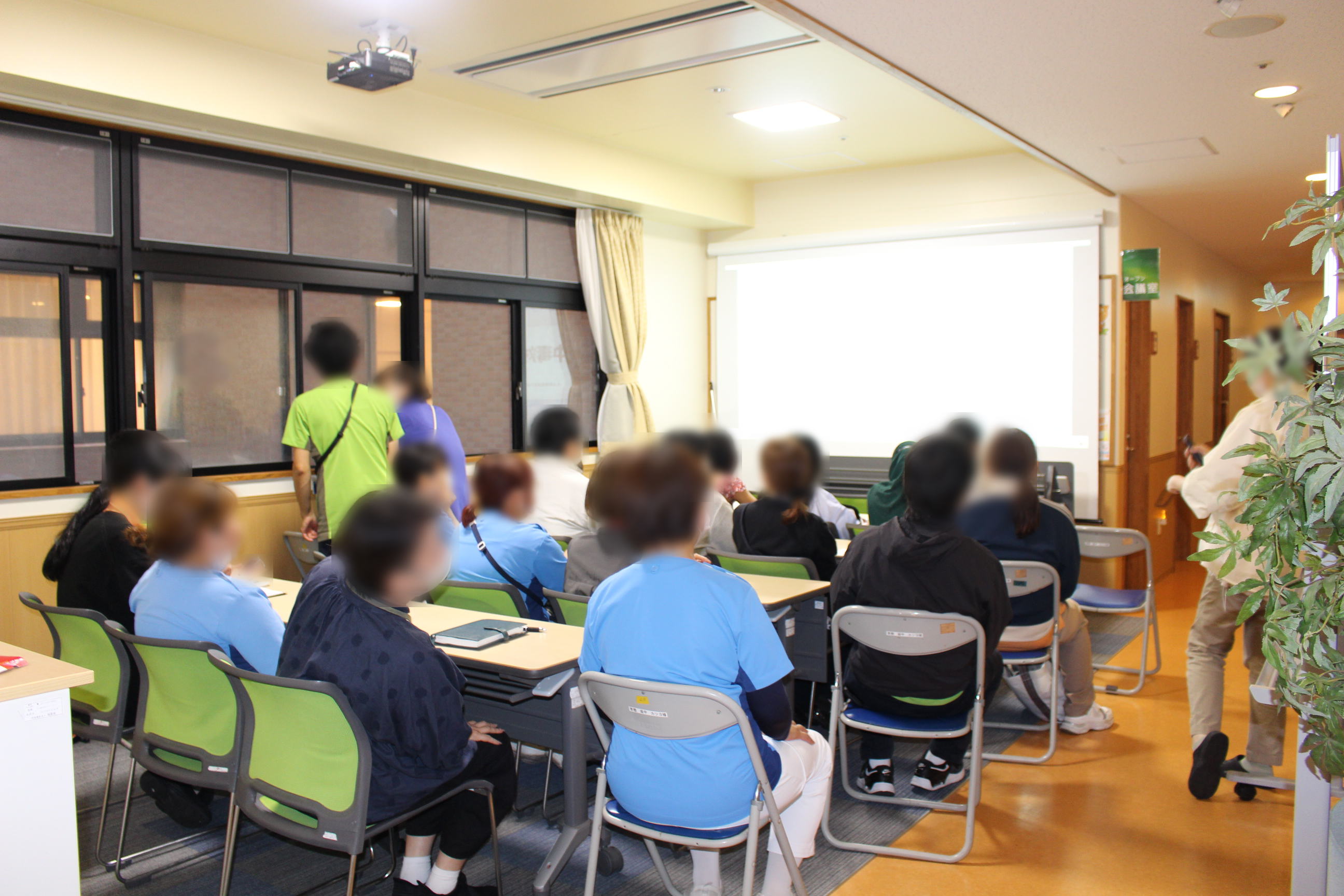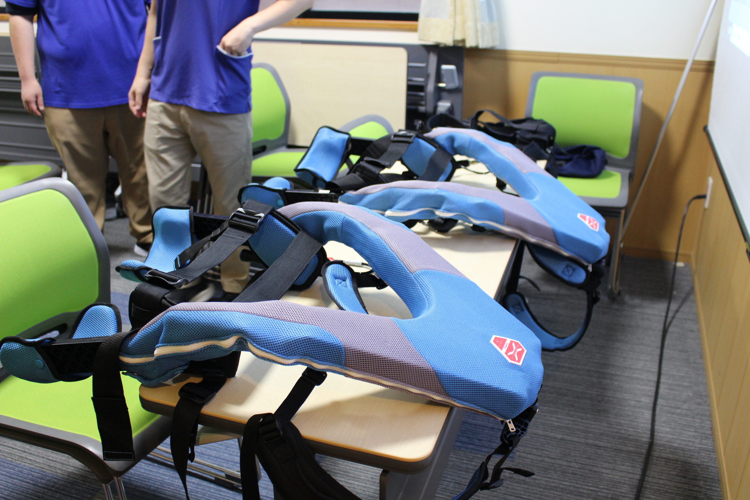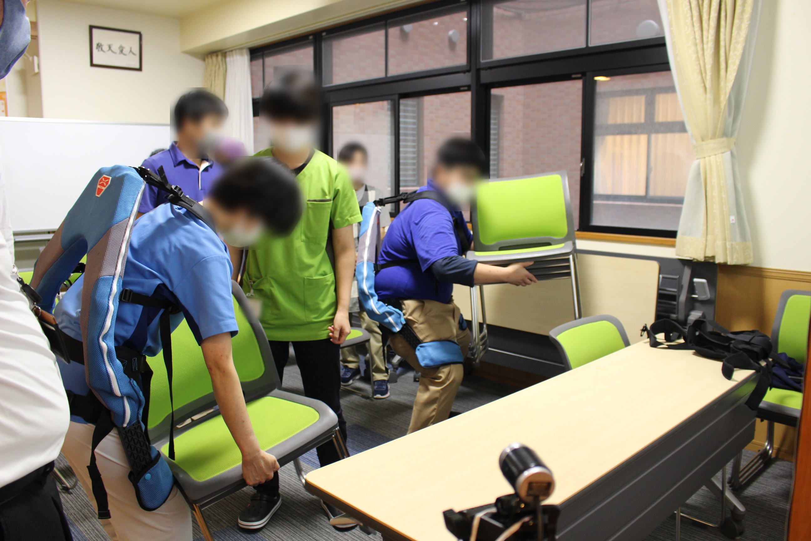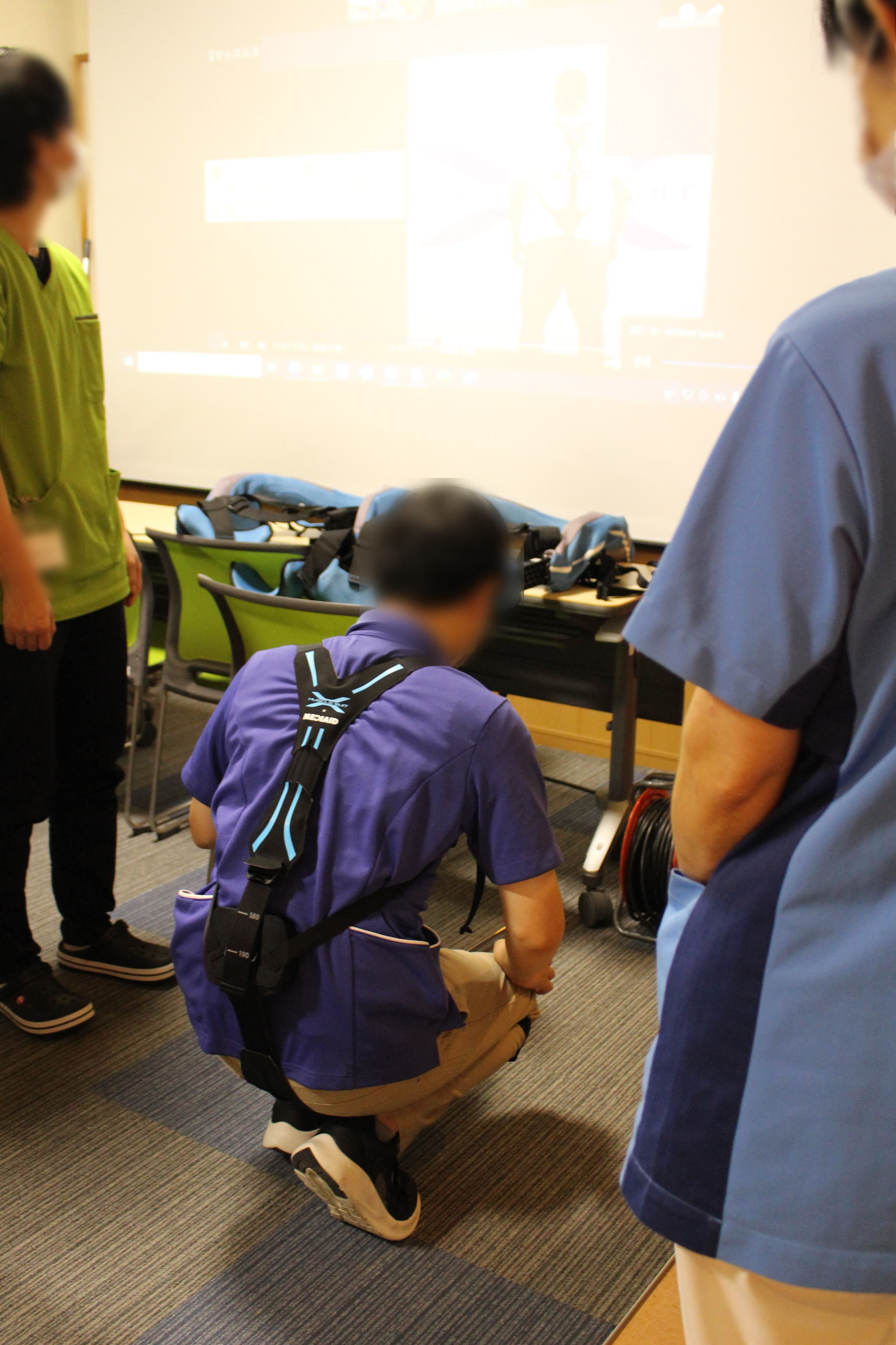 施設で働く介護従事者用のいくつかの福祉機器の導入に向けて、日々進化する機器の剪定に今回はアシストスーツのデモ機をお借りして、一定期間実際に現場で使用するため、研修会を実施しました。