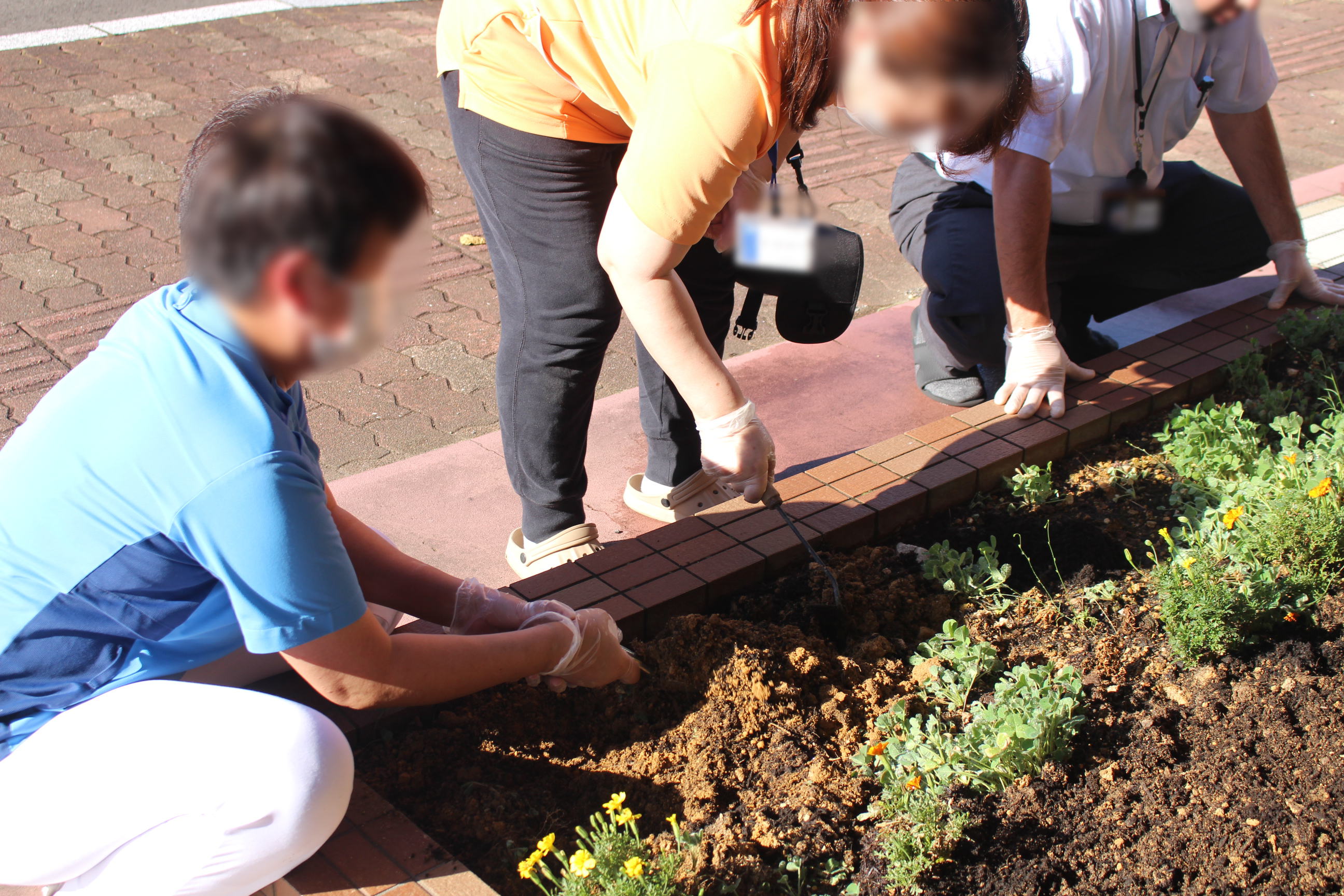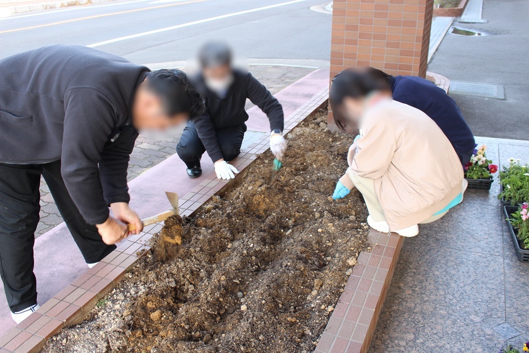 西海医療センター玄関前の花壇を耕し、季節の花の苗を植えました。