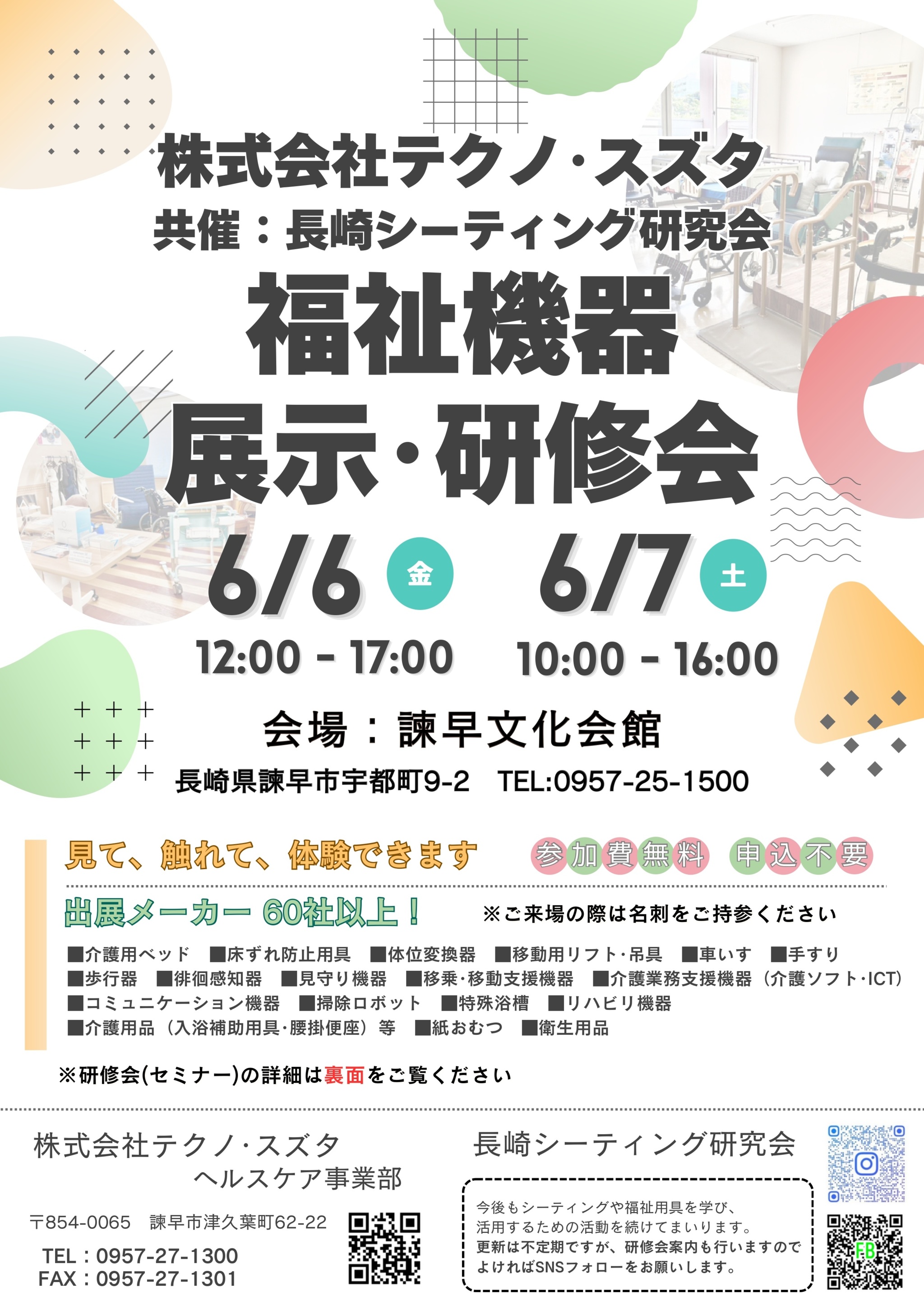 福祉機器展示・研修会は、6/6~7の諫早文化会館で行われる様々な福祉用具やサービスを展示、研修をするイベントです。